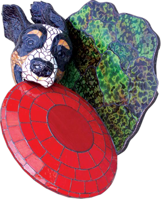 This wall-mounted sculpture is created using a series of grinders (from standard to extremely fine). Each of the thousands of pieces of glass was individually contoured on its surface to create impressions of flowing hair, shiny nose and even tarter stained teeth. Foil backing each piece allows the light to bounceback at the viewer, giving the effect of sunlight dancing off the dog's silky hair.