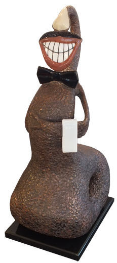 Body is composed of mottled solder over an armature covered in copper foil, with patinas of copper and black applied.\u160 The features are kiln formed glass.