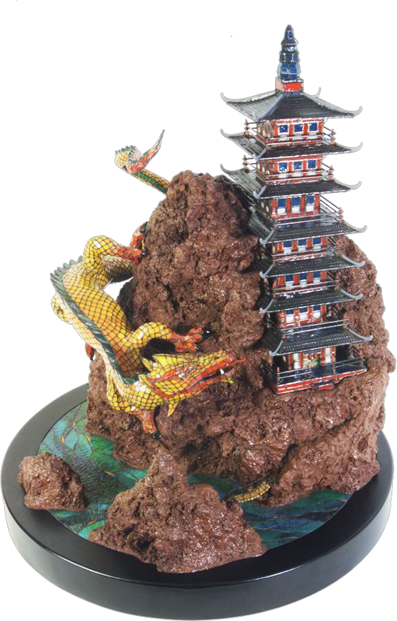 Yangze Rising neither protests nor defends this effort, but recognizes its immense significance to human history. The Yangtze River is symbolized in the creeping dragon with its long, winding tail as well as the flowing waters below. The three separate rocks represent the three gorges to be inundated by the rising river. A stained glass pagoda stands in solemn remembrance of ancient times. Finally, an incospicuos footbridge marks the unprecedented relocation of remarkable mass of humanity and the uncertainty that it entails.