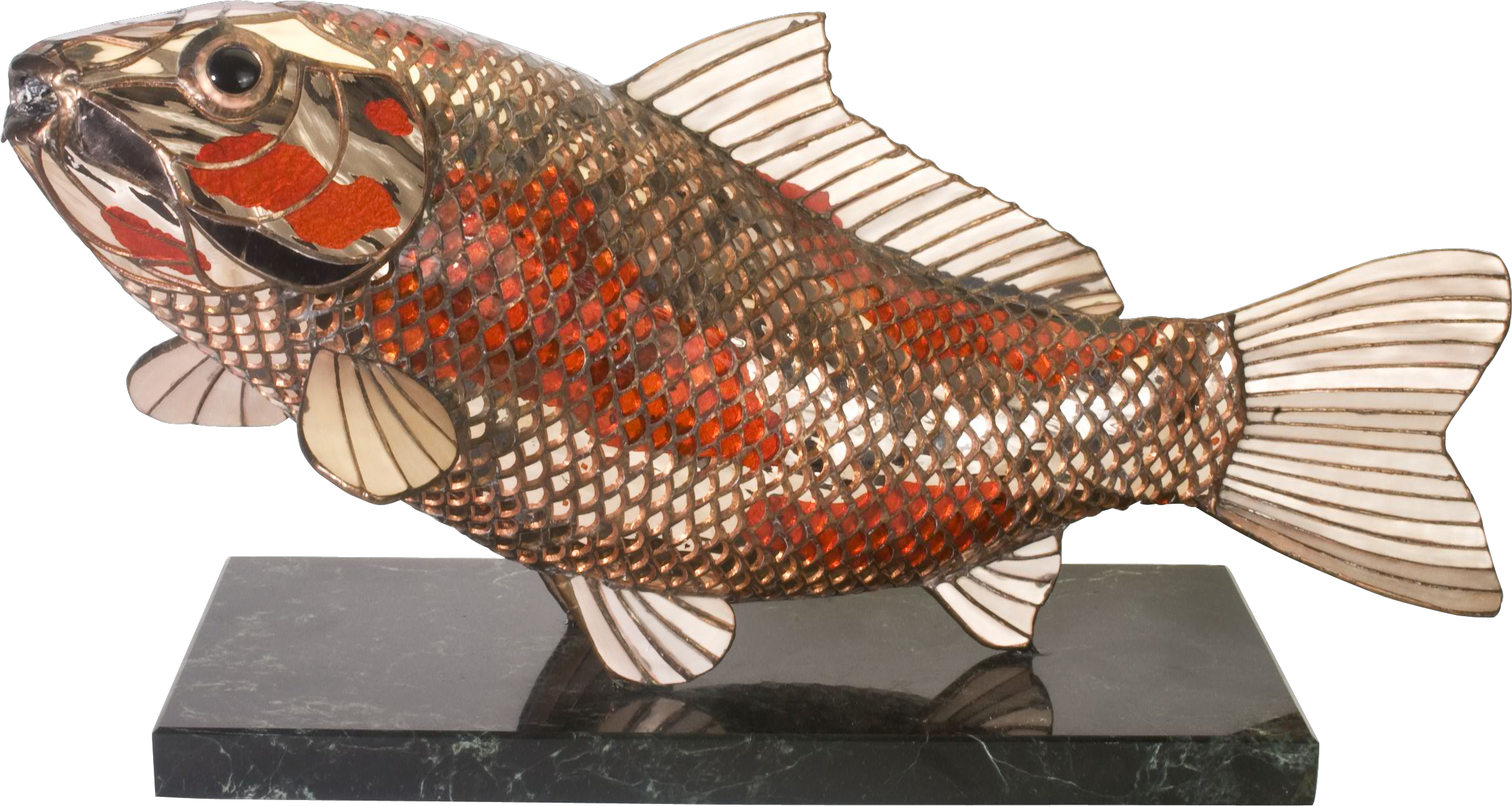 This sculpture of a glistening koi rising to the surface is 25 inches long, 12 inches high and 8 inches wide, mounted on a marble base. It is composed of approximately 2000 pieces of mirrored