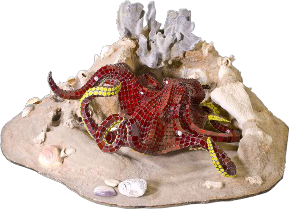 This sculpture is composed of nearly 2500 individually cut pieces of glass employing the Copper foil technique. Crafted over a period of several years and approximately 1500 working hours. Each cut piece of glass has been beveled on the back side and foiled. This permits light to refract through the glass and creates a subtle gem-like quality for each piece of glass. The soldering technique used to join the pieces is unique in that it eliminates the soldered seams along the edges where the glass pieces meet, and joins them instead at the corners with a bead of solder. This was accomplished by beveling the corners of each piece, and leaves an appearance of "bumps" on the surface of the Octopus. The skin of an octopus is normally covered in small bumps. The yellow suckers which line the tentacles are cut from sheet glass 1/8 inch thick, and formed through grinding.