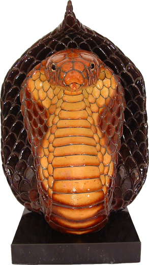 RAH is composed of 1000+ pieces of kiln produced glass. Each piece was individually produced for the color, contour and dimensions demanded by the position it occupies in the sculpture. Designs on the tail section include the traditional Egyptian image of the scarab beetle embracing the sun, as well as additional representations of the sun on the reverse side of the tail. Rah, or Ra, is the word for the Egyptian god of the sun.
