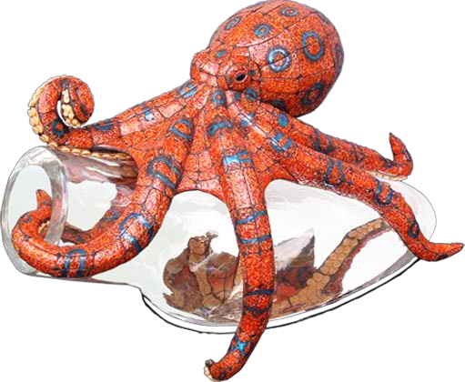 three times...to fuse the blue glass to the grinder-shaped clear glass, then to fuse the frit for the skin, and finally to fire in the enamels. The frit used for the skin had a coefficient of expansion (COE) of 96 for 4 of the colors used, and a COE of 104 for