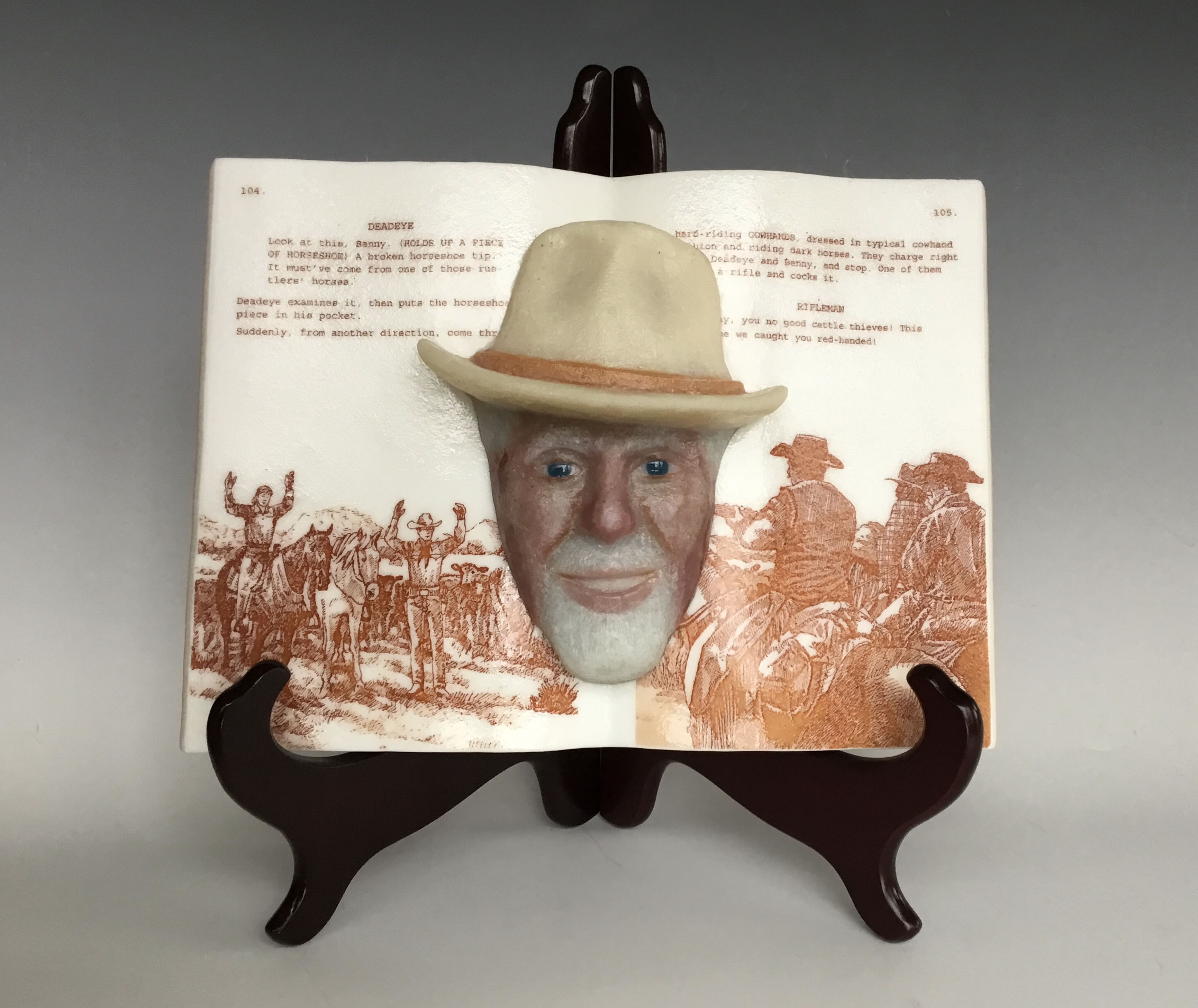 This sculpture was done for an author and friend Jay Moriarty. It has his face rising from the center pages of his book, “Deadeye”. He always wanted to be a cowboy, and now his dream will forever be met in the permanence of glass.